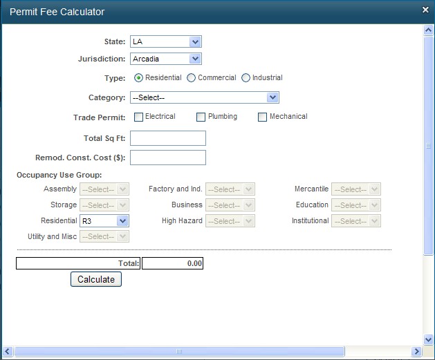 This provides quick link to a utility screen which can be used to calculate or get an estimate about the estimated fee details for a jurisdiction/permit type/permit category. The Permit Fee Calculator page appears as follows: