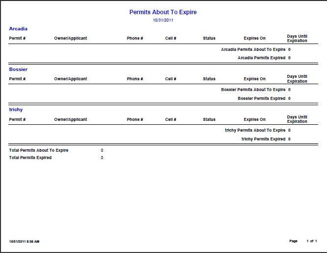 Click the Permits About to Expire link to go to the report page. This report lists the permits that are about to expire in the coming 30 days as shown below:
