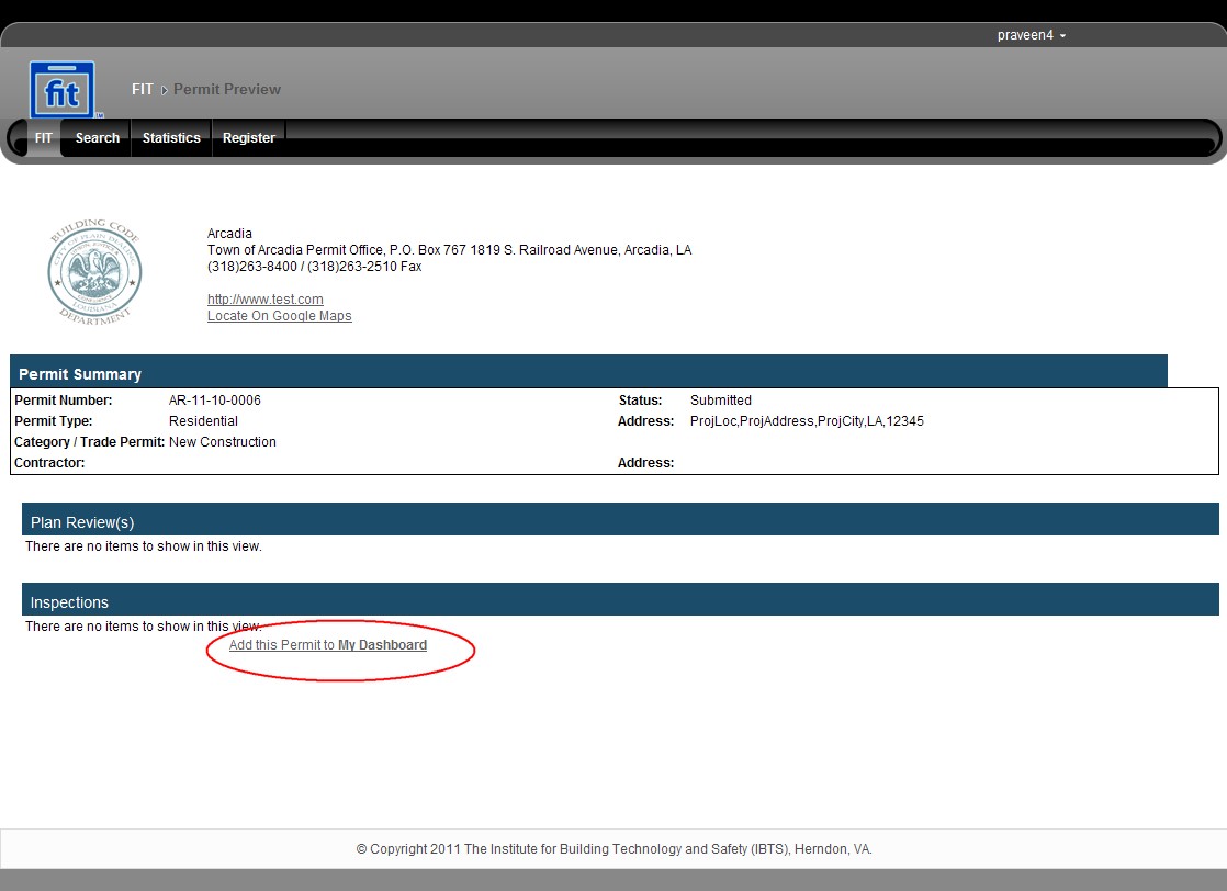 The user has the option to add this permit if required to his/her dashboard. Click Add this Permit to My Dashboard link to add the permit to the respective user's dashboard and a confirmation message appears.