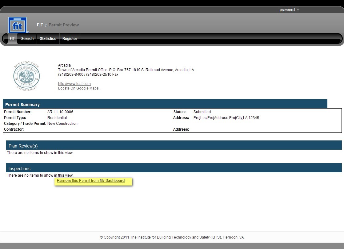 Click Remove this Permit from my Dashboard link to remove the permit.